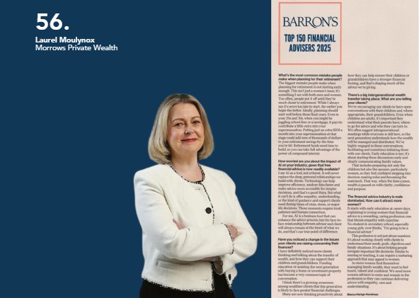 Morrows is proud to announce that Managing Director, Laurel Moulynox, has once again been recognised in the Barron’s Top 150 Financial Advisers list for 2025, placing 56th nationally.